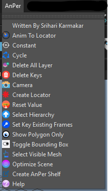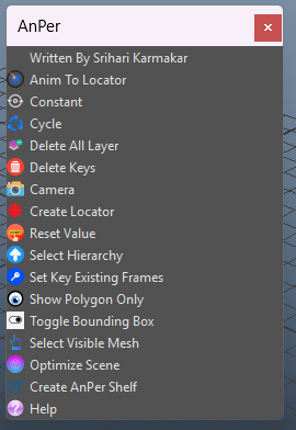 The **AnPer Script** is a custom toolkit for Autodesk Maya designed to enhance and speed up the animation workflow. It offers a range of helpful tools tailored for animators to simplify everyday animation tasks, clean up scenes, and automate repetitive actions.